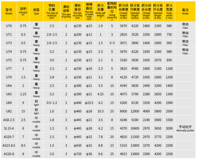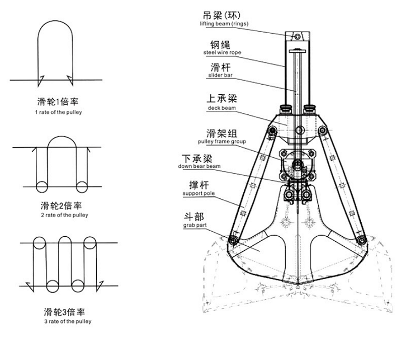 注:?jiǎn)卫K抓斗無(wú)法空中張合,手拉式和遙控式可以實(shí)現(xiàn)在控制打開(kāi)。