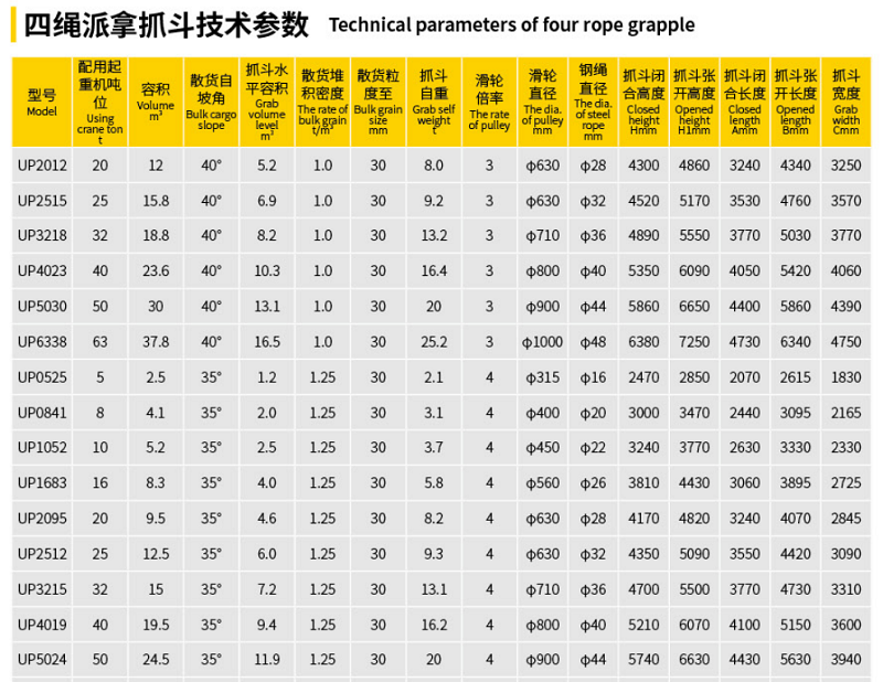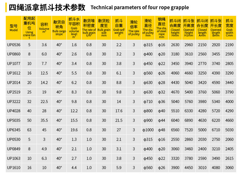 應(yīng)用:UP系列派拿雙顎瓣抓斗造型新穎、結(jié)構(gòu)合理、抓取物料重量與抓斗自重之比達(dá)到1.5~1.92,充滿(mǎn)度達(dá)到95%~100%是最小粒度松散物的理想抓具。與傳統(tǒng)的普通四繩抓斗相比較有以下特點(diǎn):下承梁架構(gòu)縮短、強(qiáng)度好、自重輕;主要鉸點(diǎn)的襯套材質(zhì)為軸承鋼。延長(zhǎng)使用壽命4~5倍,刃口板合縫間隙小,可達(dá)到0.3mm~1mm能保持作業(yè)場(chǎng)所清潔,整體結(jié)構(gòu)不易變形不錯(cuò)口,本類(lèi)型抓斗可設(shè)計(jì)為雙繩。