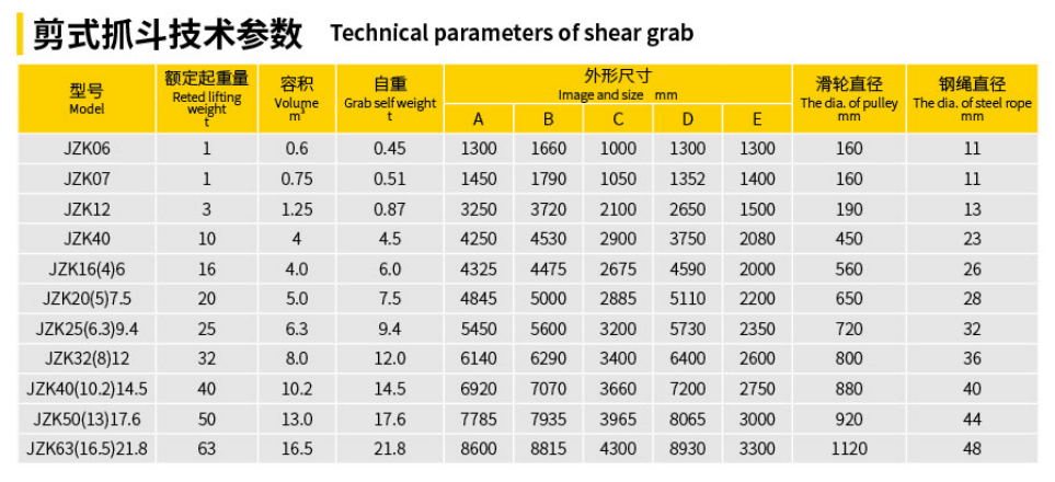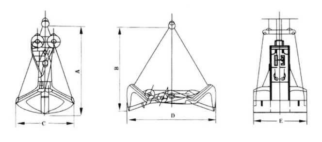 剪式抓斗是把兩個(gè)顎板靠鉸點(diǎn)的端部延長為繩索式加力臂,兩臂公用一個(gè)叫中心鉸點(diǎn),剪式抓斗開啟動(dòng)作依靠放松剪臂處滑輪組的鋼絲繩,收緊支撐繩來完成,關(guān)閉動(dòng)作依靠收緊滑輪組的鋼絲繩嗎,利用杠桿原理增力,是顎板閉合抓取物料,其閉合力矩隨著閉合過程逐漸增加,抓取物料時(shí)干凈不漏料,多用在大型橋式卸船機(jī)上。