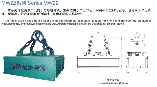 應(yīng)用:本系列為應(yīng)用最廣泛的長(zhǎng)方形電磁鐵,主要適用于吊運(yùn)方坯,鋼錠和大型初軋坯等,也可適用于吊運(yùn)圓坯,型鋼等。針對(duì)不同類型的鋼材,采用不同的磁路設(shè)計(jì)。